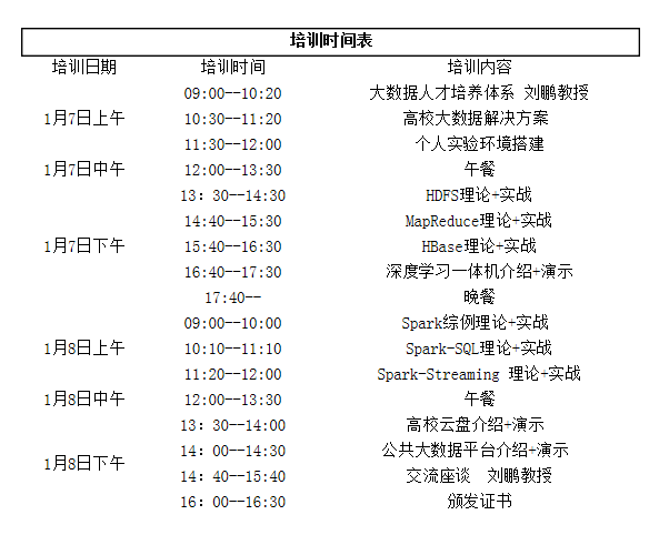 基于此,由清华大学博士、中国信息协会大数据分会副会长刘鹏教授倾情授课,金陵科技学院与江苏省云计算论坛主办,英特尔(中国)公司与电子工业出版社协办,南京云创大数据科技股份有限公司承办的第二期全国高校(高职)大数据师资免费培训班开班在即。刘鹏教授希望能用高效的方法,在两天内为全国高校免费培养一大批教师,使他们跨过“从理论到实践,从知道到用过”的门槛。