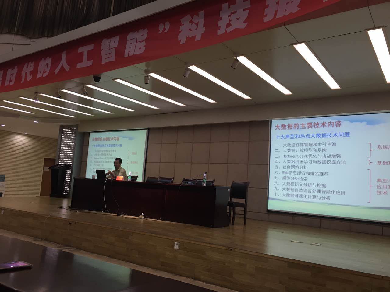 6月8日,中国计算机学会“CCF走进高校”以及江苏省科协“百名首席科技传播专家进百校”活动走入宿迁学院,由CCF南京分部、省计算机学会、宿迁市科协、市计算机学会共同主办的“大数据时代的人工智能”科技报告会在宿迁学院新图书馆报告厅举行,南京大学博士生导师黄宜华(CCF大数据专委会副秘书长)和高阳(CCF南京副主席)两位教授作为CCF委派的专家在此次科技传播报告会上演讲。报告会由宿迁学院信息工程学院院长李国栋主持,宿迁学院副校长王宝安在报告会上致欢迎辞,宿迁市科协学会学术部部长罗列、宿迁市计算机学会秘书长陈林出席。