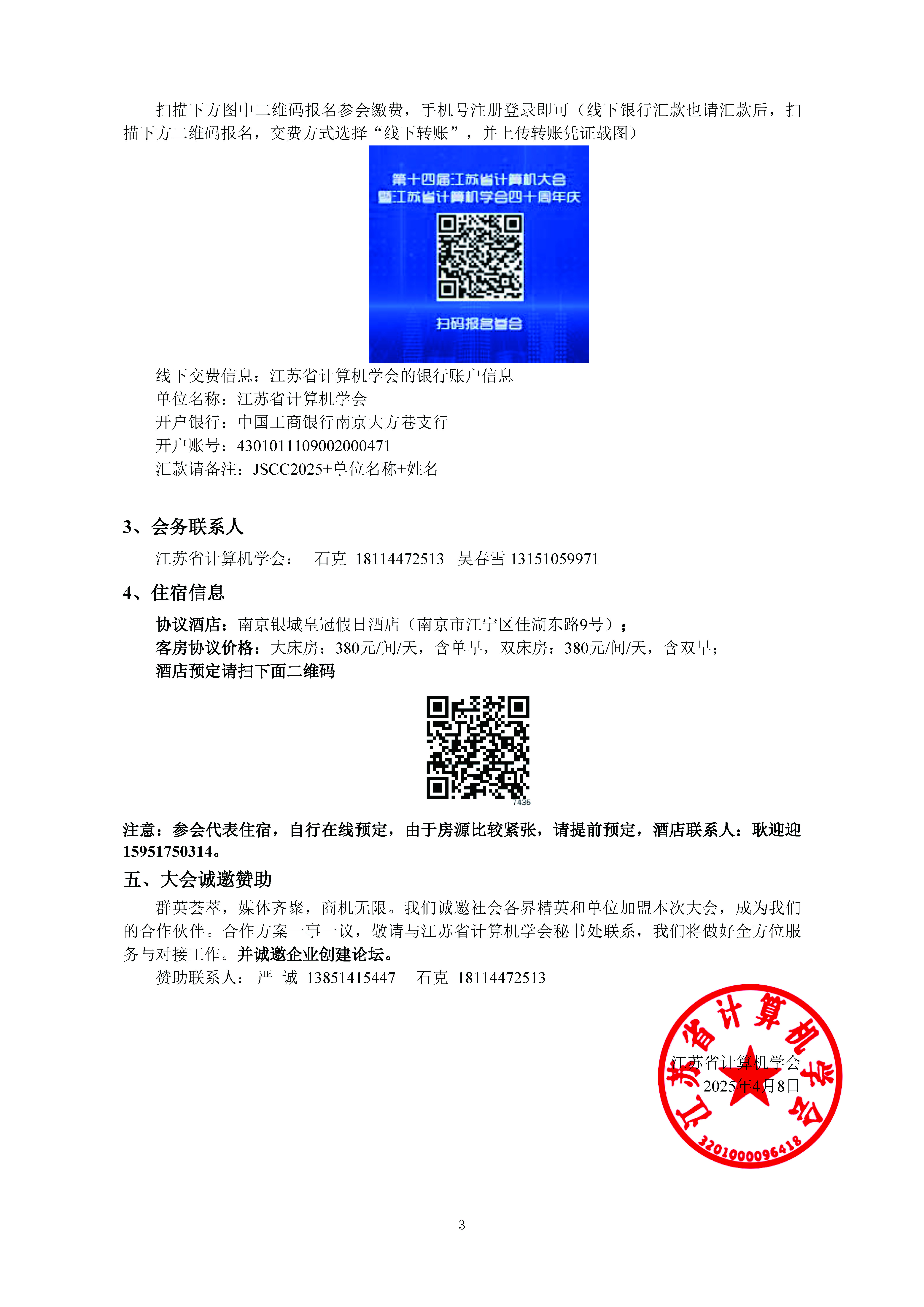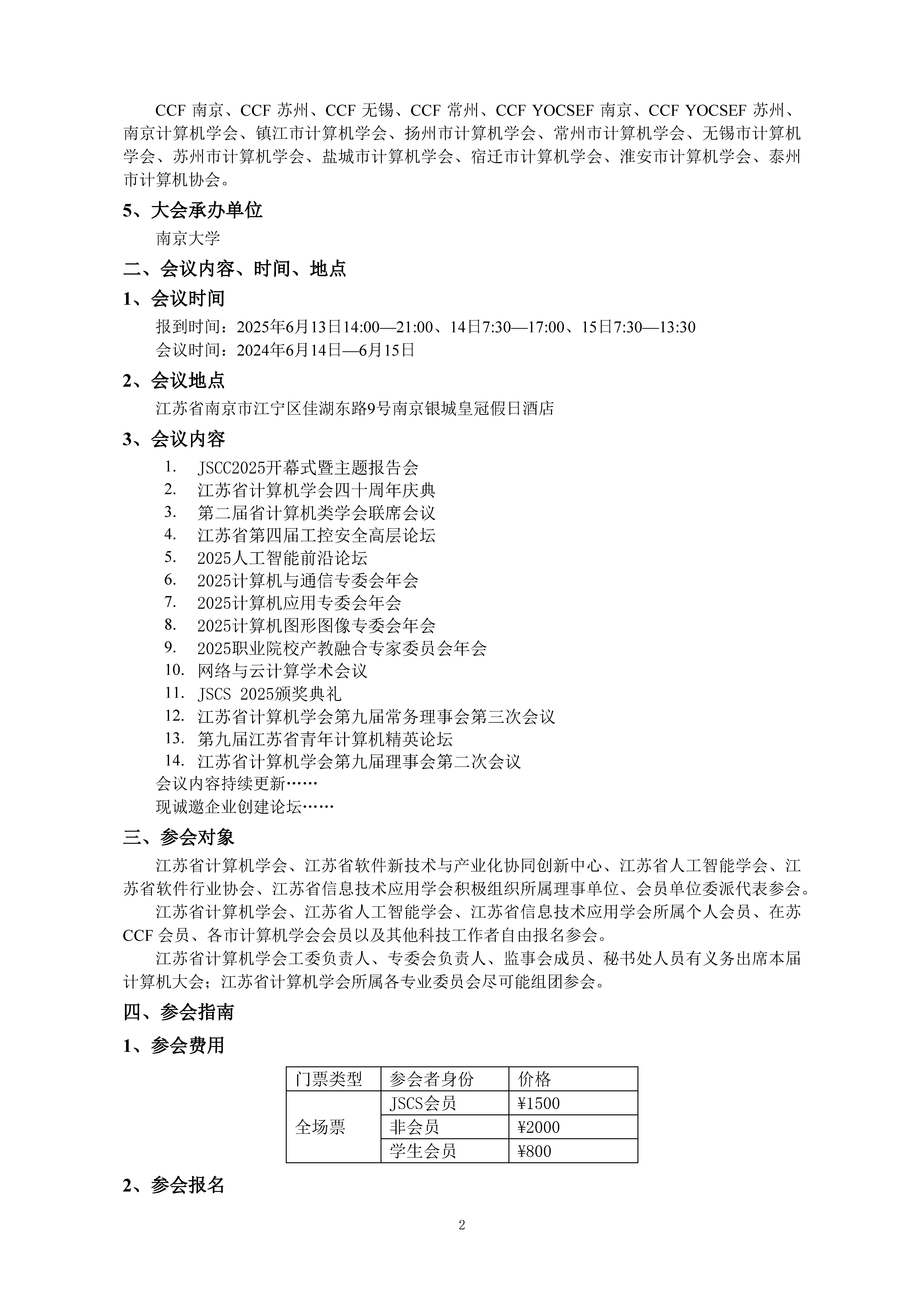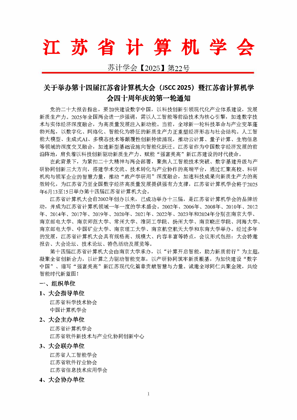 关于举办第十四届江苏省计算机大会(JSCC 2025)暨江苏省计算机学会四十周年庆的第一轮通知