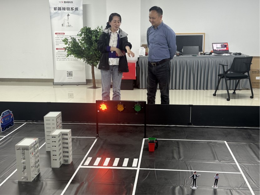 墨问科技技术总监曹工现场展示了“智慧物流”“智慧社区”两个场景化教学内容,这些内容同时也是中国大学生计算机设计大赛智慧物流赛道和全球校园人工智能算法精英大赛智慧社区赛道的重要赛事内容。在展示中,智能小车需在模拟场景中完成特定任务,通过竞赛形式全面锻炼学生的综合能力。金莹秘书长对比赛场景在考察学生能力方面的作用表示认可,并建议进一步细化场景设置,将现有场景分解为更具针对性的子场景,以更精准地提升学生的专业技能。