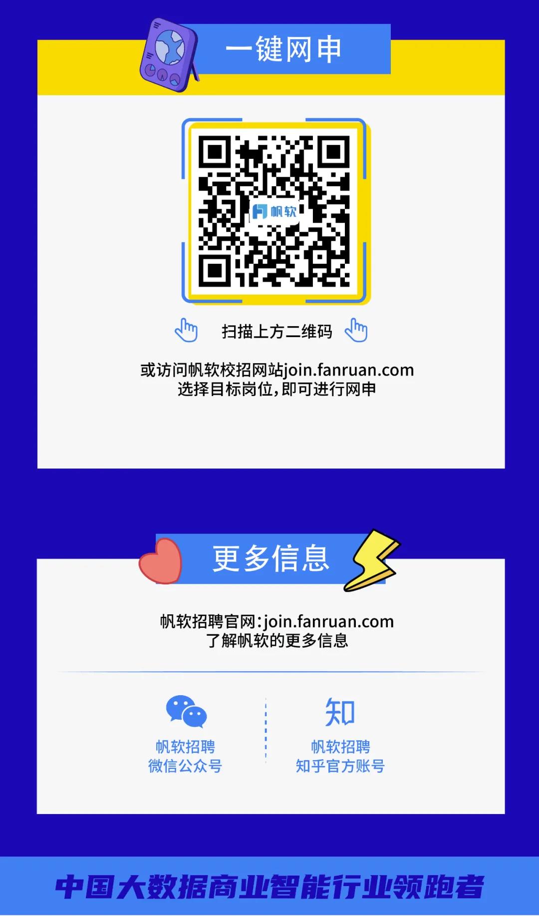 A:校招期间全程接受内推和网申,以招聘官网挂出的信息为准。了解帆软招聘的最新情况,敬请关注http://join.fanruan.com/