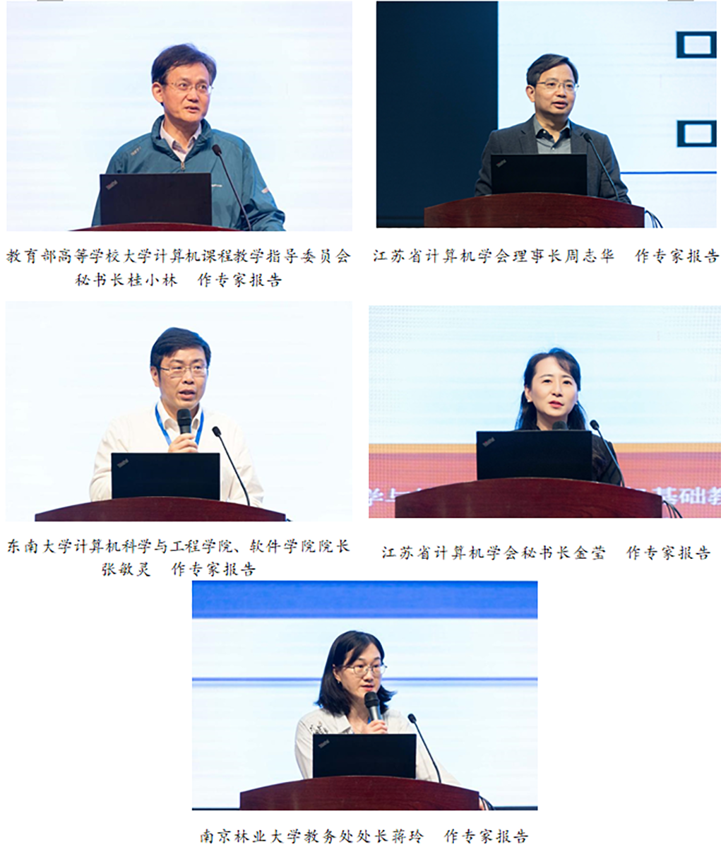 会议邀请了教育部高等学校大学计算机课程教学指导委员会秘书长桂小林、江苏省计算机学会理事长周志华、东南大学计算机科学与工程学院、软件学院院长张敏灵、江苏省计算机学会秘书长金莹、南京林业大学教务处处长蒋玲分别就AI赋能下的大学计算机基础教育改革、人工智能本科教育培养体系建设、“人工智能+”多层次教学探索实践、人工智能下的程序设计课程教学及作主题报告。