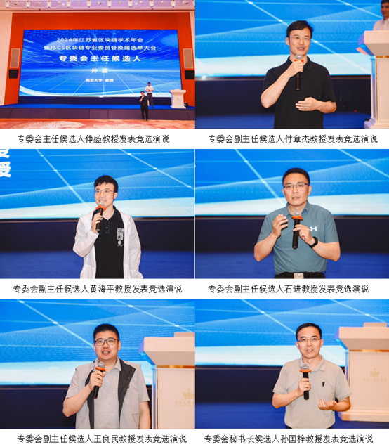 本次大会也开展了区块链专业委员会换届选举会议。换届选举大会由南京大学申富饶教授和南京审计大学景波教授主持,JSCS区块链专委会首届副主任委员孙国梓教授作工作报告。委员增选环节中增补委员16人,新申请委员19人。换届选举中仲盛教授再次当选第二届区块链专业委员会主任,南京信息工程大学付章杰教授、南京邮电大学黄海平教授、南京大学石进教授、东南大学王良民教授出任新一届专委会副主任,南京邮电大学孙国梓教授出任专委会秘书长,江苏知链科技有限公司总经理施亚东先生、江苏大学宋香梅副教授担任主委会副秘书长。会议还商定了新一届专委会执行委员名单。