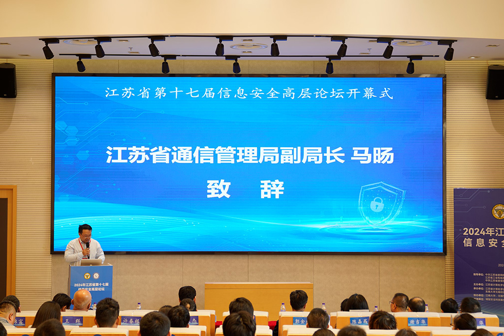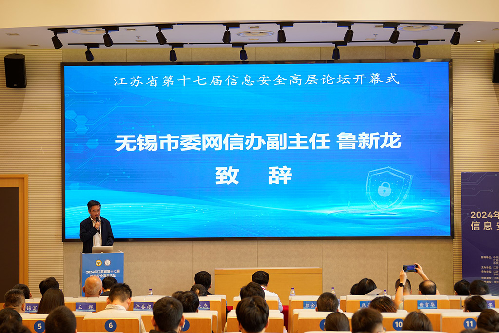 江苏省计算机学会信息安全专委会主任、东南大学网络空间安全学院副院长陈立全教授主持开幕式。东南大学无锡校区秦文虎副主任、江苏省通信管理局马旸副局长、无锡市委网信办鲁新龙副主任、江苏省计算机学会金莹秘书长出席开幕式并致辞。