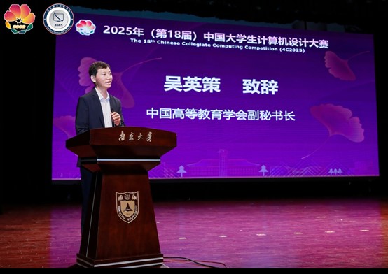 中国高等教育学会副秘书长吴英策在致辞中代表中国高等教育学会祝贺第18届4C南京南决赛区圆满收官,感谢南京大学与各方保障3000名学子在“微课与AI辅助教学、数媒静态设计”赛道上的精彩表现。他提出立德树人、教育数字化、产教融合三点倡议,期待青年学子把竞赛经验转化为破解“卡脖子”难题的创新力量,共同打造计算机教育强国。