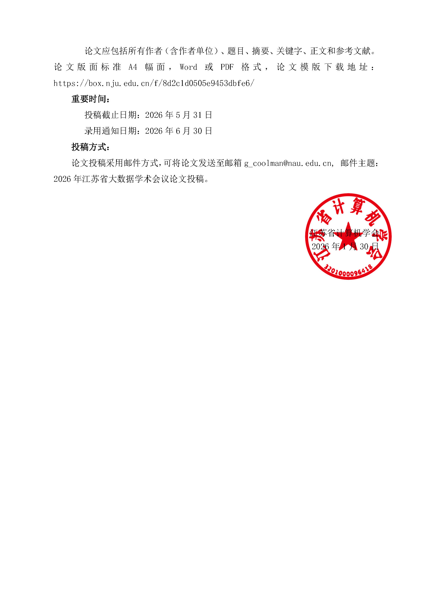 2026年江苏省大数据学术会议征稿通知