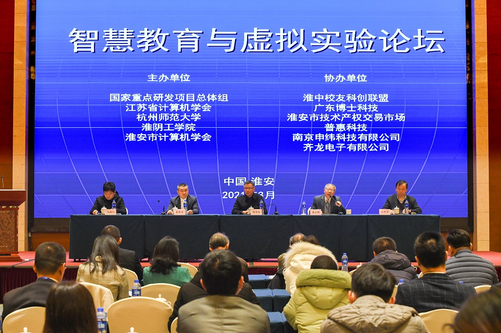 由国家重点研发项目总体组发起,江苏省计算机学会、杭州师范大学、淮阴工学院主办,淮安市计算机学会承办,淮中校友科创联盟、广东博士科技协办的智慧教育与虚拟实验论坛,于2021年3月19日在淮安市国联奥体明都酒店成功召开。来自全国20多所高校百余师生参与了本次论坛,论坛同时还邀请了淮安市教育局、电教馆、淮安市科协技术协会等有关人士及淮安市中学骨干教师50余位代表参与此次论坛。本次论坛基于国家重点研发计划项目《多模态自然交互的虚实融合开放式实验教学环境》的成果,成果面向初中和高中的实验教学,项目共设5个课题组,项目总牵头单位为杭州师范大学,首席科学家为潘志庚教授,总研究经费2237万,自2018年开始, 2021年完成该项目。