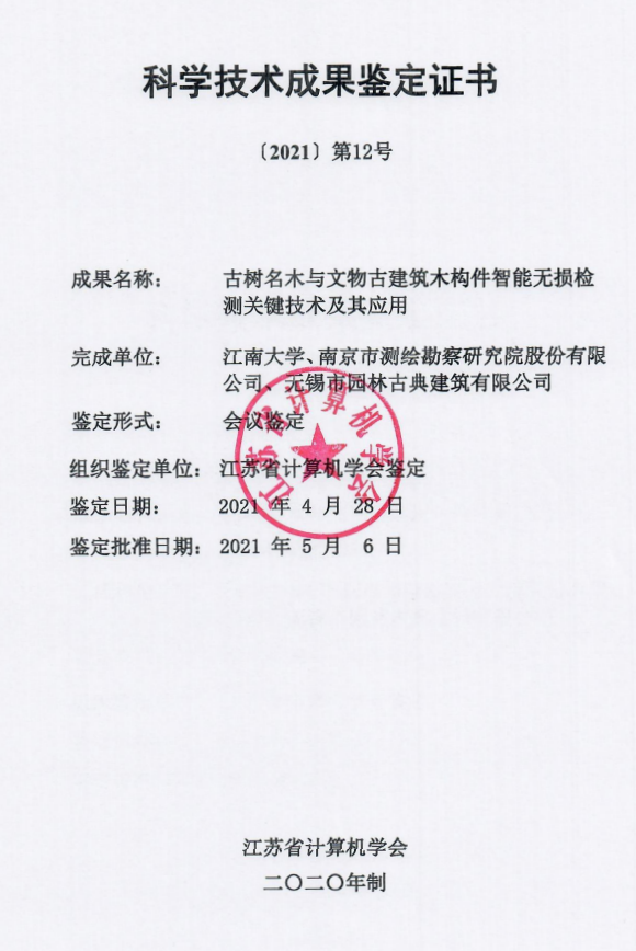 2021年4月28日,江苏省计算机学会受江南大学、南京市测绘勘察研究院股份有限公司、无锡市园林古典建筑有限公司委托在南京组织召开了江南大学等单位“树木与文物古建筑木结构的品质智能检测关键技术研究与应用”项目技术鉴定会。会议由省计算机学会秘书长金莹主持。此次鉴定会委员会由来自中国科学技术大学计算机学院、南京航空航天大学计算机科学与技术学院、南京邮电大学计算机学院、湘潭大学计算机学院、南京大学计算机科学与技术系、南京林业大学材料科学与工程系等单位专家组成。