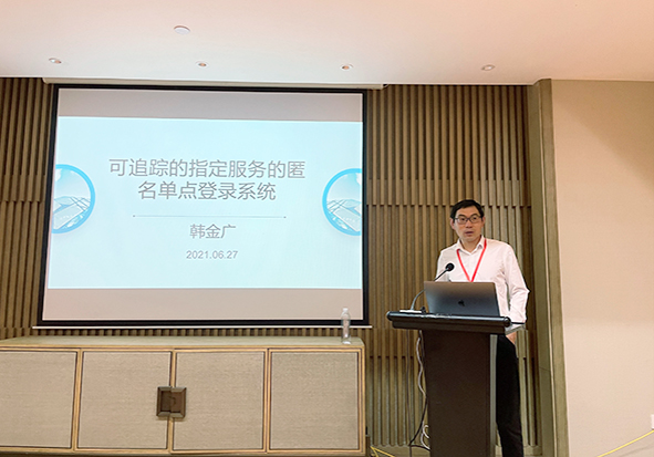 来自南京财经大学的韩金广教授作了“可追踪的制定服务的匿名单点登录系统”主题报告,韩教授从常见的淡点登录需求出发,从系统初始化、注册、电子票据生成等多阶段对方案进行了构造,在此基础上,对方案的安全性进行了分析,最后介绍了方案的实现效果。