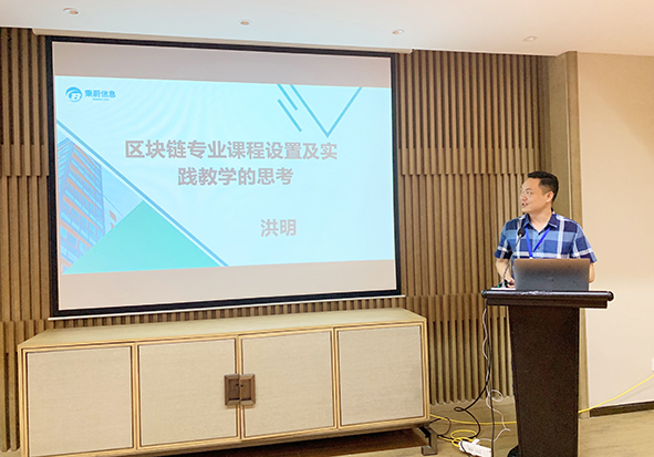 论坛的最后,来自南京秉蔚信息科技有限公司的总经理洪明先生做了“区块链专业课程设置及实践教学的思考”的主题报告,就区块链专业高校开课的现状、培养方案、课程体系、培养目标等内容跟与会者进行了沟通。
