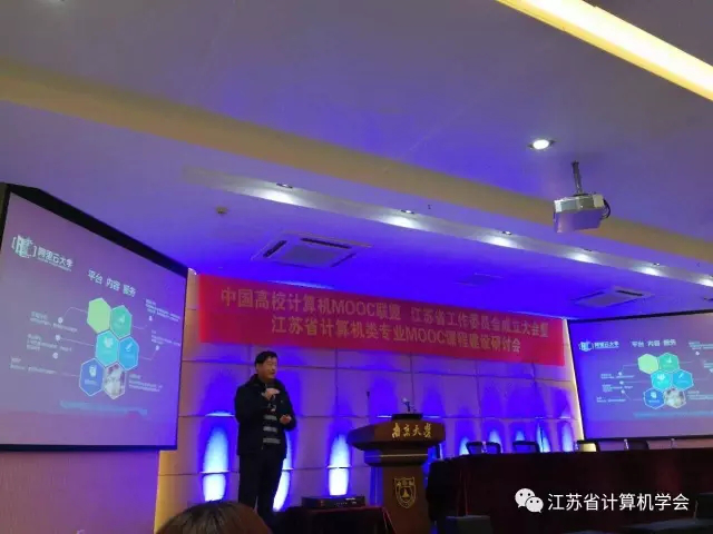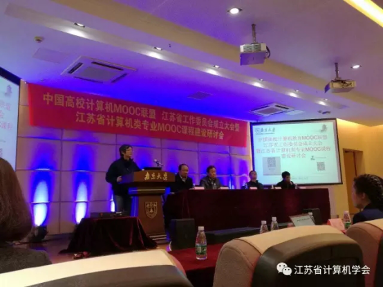 3月30日下午,中国高校计算机教育MOOC联盟江苏省工作委员会成立大会暨江苏省计算机类专业MOOC课程建设研讨会在南京大学仙林校区召开,会议由江苏省计算机学会承办。南京大学教务处处长邵进代表东道主致欢迎辞,省计算机学会秘书长杨献春致贺辞,MOOC联盟副理事长、北京大学教授李晓明代表联盟向江苏省工作委员会主任陶先平(省计算机学会教育工委主任)授牌。李晓明教授作了《慕课发展机遇与挑战》主题报告,MOOC联盟办公室主任陈哲、知途网总经理俞京华、南京大学计算机基础教学部副教授张莉、南京邮电大学计算机学院胡素君副教授也在会上进行了交流。MOOC联盟江苏省工委将组建4个专项工作组开展MOOC课程建设及优秀课程认定、省级MOOC试点学院遴选、MOOC师资培训、发展会员等工作。