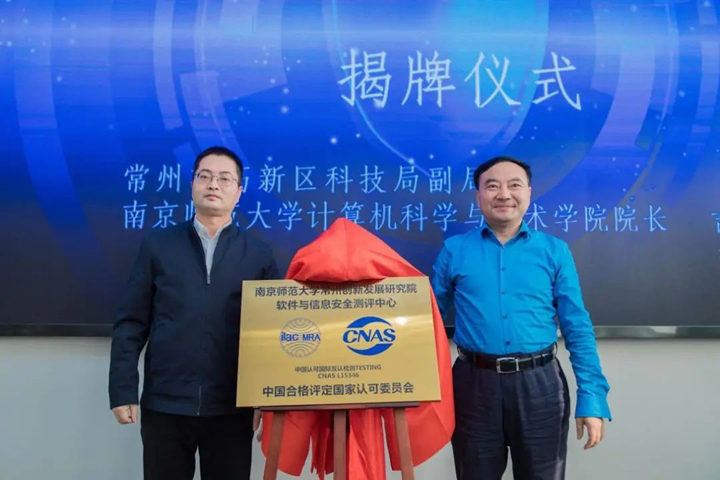 常州市高新区科技局副局长陆伟、南京师范大学计算机科学与技术学院院长吉根林为“测评中心CNAS国家认可实验室”揭牌。