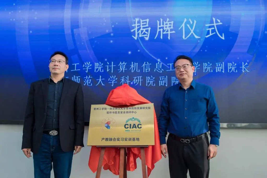 常州工学院计算机信息工程学院副院长何中胜、南京师范大学科研院副院长刘志国为“产教融合实习实训基地”揭牌。