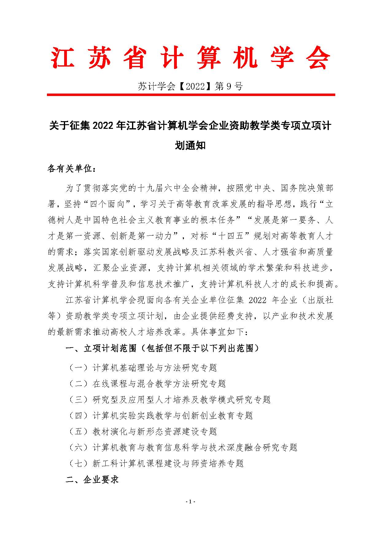 附件1 江苏省计算机学会2022年企业资助教学类专项资金项目申报书