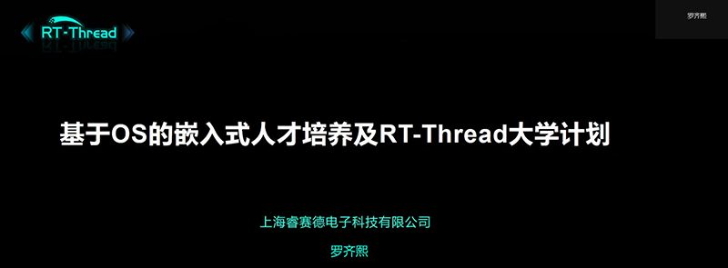本次培训历时两天,培训首日,上海睿赛德电子科技有限公司罗齐熙总经理分享了“基于RT-Thread OS 国产化嵌入式软件人才培养及RT-Thread大学计划”,从企业的人才需求及岗位技能要求出发,介绍了RT-Thread基于RTOS的人才培养及RT-Thread物联网操作系统现状与前景、校企合作及嵌入式AI领域所做的一些工作。