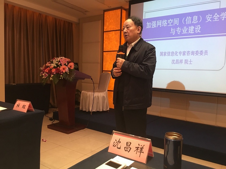 沈昌祥院士作了题为"加强网络空间(信息)安全学科与专业建设"的报告,他在报告中介绍网络空间安全一级学科创建历程及目前学科概况,阐明学科的人才培养目标和主要研究方向及内容,概括性陈述学科的理论和方法论基础以及基础知识体系,并提出了加强网络空间学科专业建设的建议。六条建议是:1、加强领导,统筹指导全国网络空间安全学科专业建设;2、采取有力措施,加快学科专业和院系建设;3、创新驱动,改革人才培养模式和机制;4、加快师资队伍建设,提高教学质量;5、加强教材和课程建设,提高科技知识水平;6、建设开放实训平台,推动高校与企事业单位合作育人。