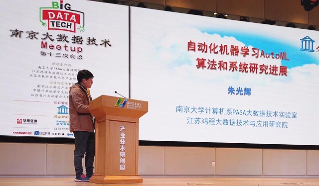 在第一个报告中,南京大学PASA大数据实验室博士研究生朱光辉先生给大家作了题目为“自动化机器学习算法与系统研究进展”的演讲。朱博士在报告中提出,机器学习与人工智能技术目前已经广泛应用在各个行业,然而机器学习和人工智能技术门槛较高,目前主要依赖专业人员的人力和经验。数据分析人员不仅要熟练掌握和使用各种算法模型,而且还要熟悉每个算法的超参数调优技巧。因此朱博士提出如何设计高效的全生命周期的数据分析流程是非常具有挑战性的。为了解决上述问题和挑战,研究人员开始尝试自动化机器学习(AutoML),即用机器去自动化地完成模型选择和参数调优,让模型设计自动化,替代人工方式进行模型设计的过程,从而大量节省人力,降低机器学习算法设计的门槛,提高建模的效率。朱博士的本次分享涉及到AutoML的多个技术层面,包括自动化超参调优、自动化模型选择以及自动化特征工程。同时,本次分享也重点介绍了南京大学PASA大数据实验室在AutoML算法和系统方面的最新进展和成果,现场观众受益匪浅。