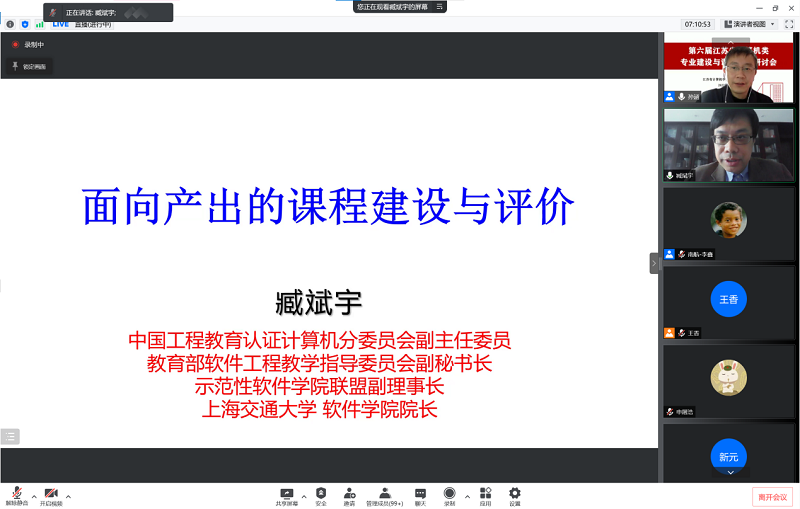 为进一步提升高校教师对工程教育专业认证的理解,推动计算机类专业建设,改善计算机类专业人才培养质量,江苏省计算机学会计算机教育专委会于4月16日在线召开了“第六届江苏省计算机类专业建设与课程改革研讨会”。特邀上海交通大学臧斌宇教授、四川大学洪玫教授两位专家基于认证的核心理念探讨课程建设。300余教师代表参加会议,专委主任陈兵致辞,会议由专委秘书长孙涵主持。