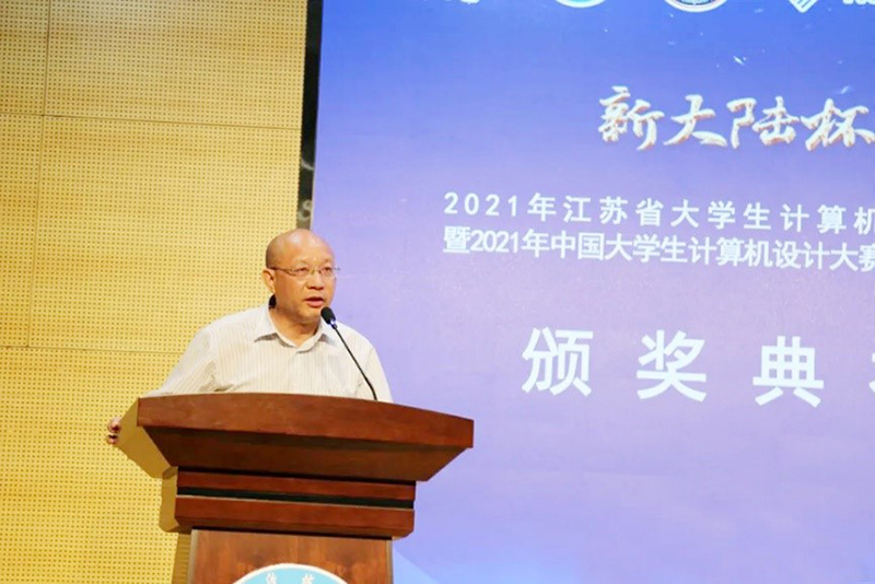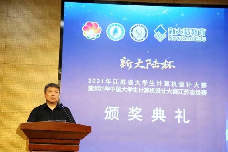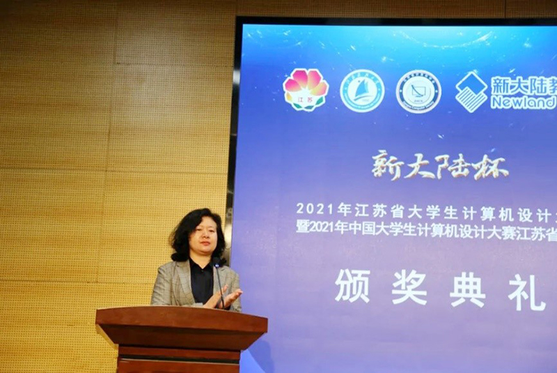 江苏省教育厅高教处一级调研员蔡华处长、大赛承办单位江苏科技大学副校长嵇春艳教授、大赛赞助单位新大陆时代教育科技有限公司江苏子公司总经理林丽明、大赛主办单位江苏省计算机学会秘书长金莹教授分别为闭幕式致辞发言。