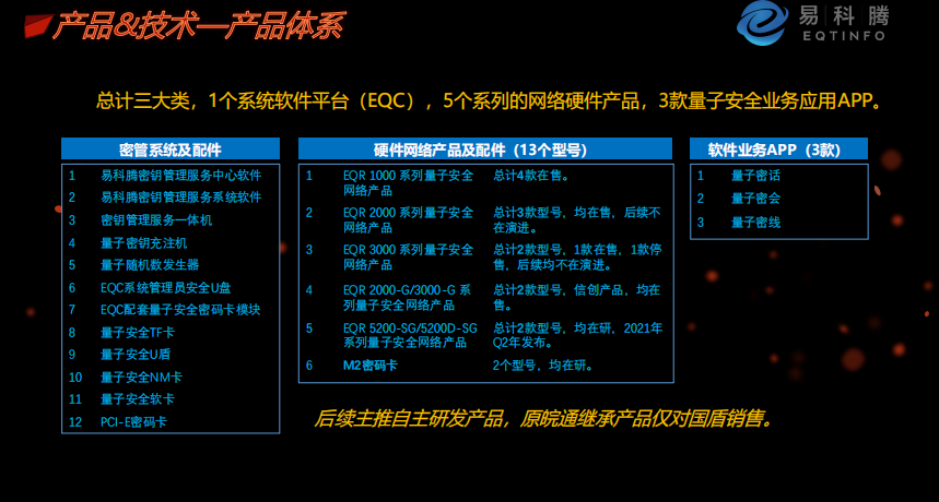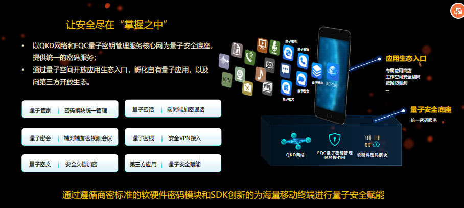 概述:公司主要有四大解决方案:量子保密通信专网解决方案、统一密钥管理服务解决方案、量子安全虚拟专网解决方案、量子安全移动应用解决方案,两大产品体系:量子密钥应用硬件平台和量子安全移动应用平台。