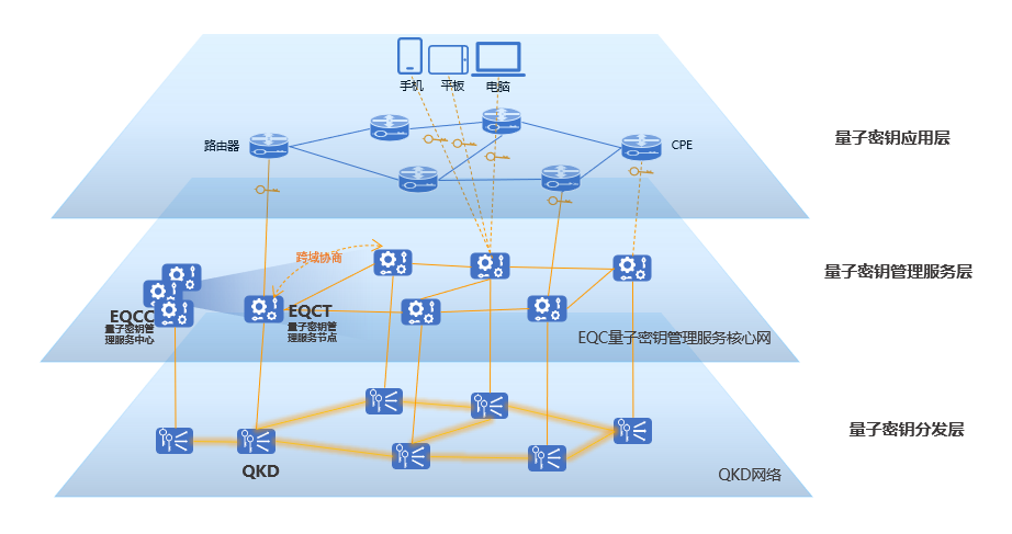 1、量子密钥管理服务中心(简称:EQCC),是量子密钥管理服务核心网的管理中心,管理量子密钥管理服务核心网内的EQCT节点及其归属节点下的应用设备信息和密钥信息,为应用设备进行跨域互通、归属寻址和统一管控提供支撑服务。EQCC架构上支持集群和分级部署,能快速扩容以适应应用规模,可灵活划域以实现精细管理。