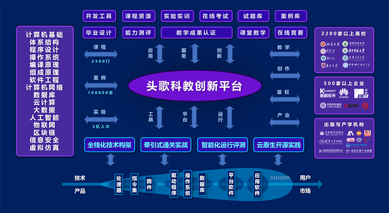 头歌依托广大高校师生和企业专家,围绕信息技术实践教学领域的痛点和挑战,构建了一个良性发展的产学研用生态系统。